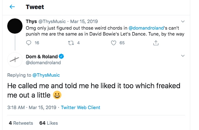 I was getting to that, sheesh. OK so at this point, I was at the bottom of what I already explained to be a three-page thread. I have a habit of not really going through a whole ass thread if I read the OP and have some thoughts. I was bored (and getting a lil tips) and decided to scroll up, where I found Dom NOT talking about the intro of this 20-year-old gem of his but sharing a story that he mentioned he’s “forever telling”, a point which was proven a page earlier via a screenshot of tweets from March 2019, featuring Thys (Noisia, Dotcrawl) sharing a very interesting Bowie tidbit related to “Can’t Punish Me”.